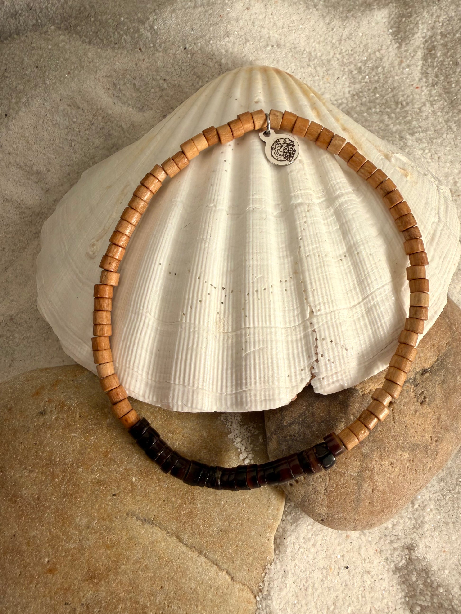 This is an everyday stretch anklet that measures 9 inches. Handmade with wooden beads, and black lip shells. Around the back is the signature Lindsea & Co. stainless logo charm.
