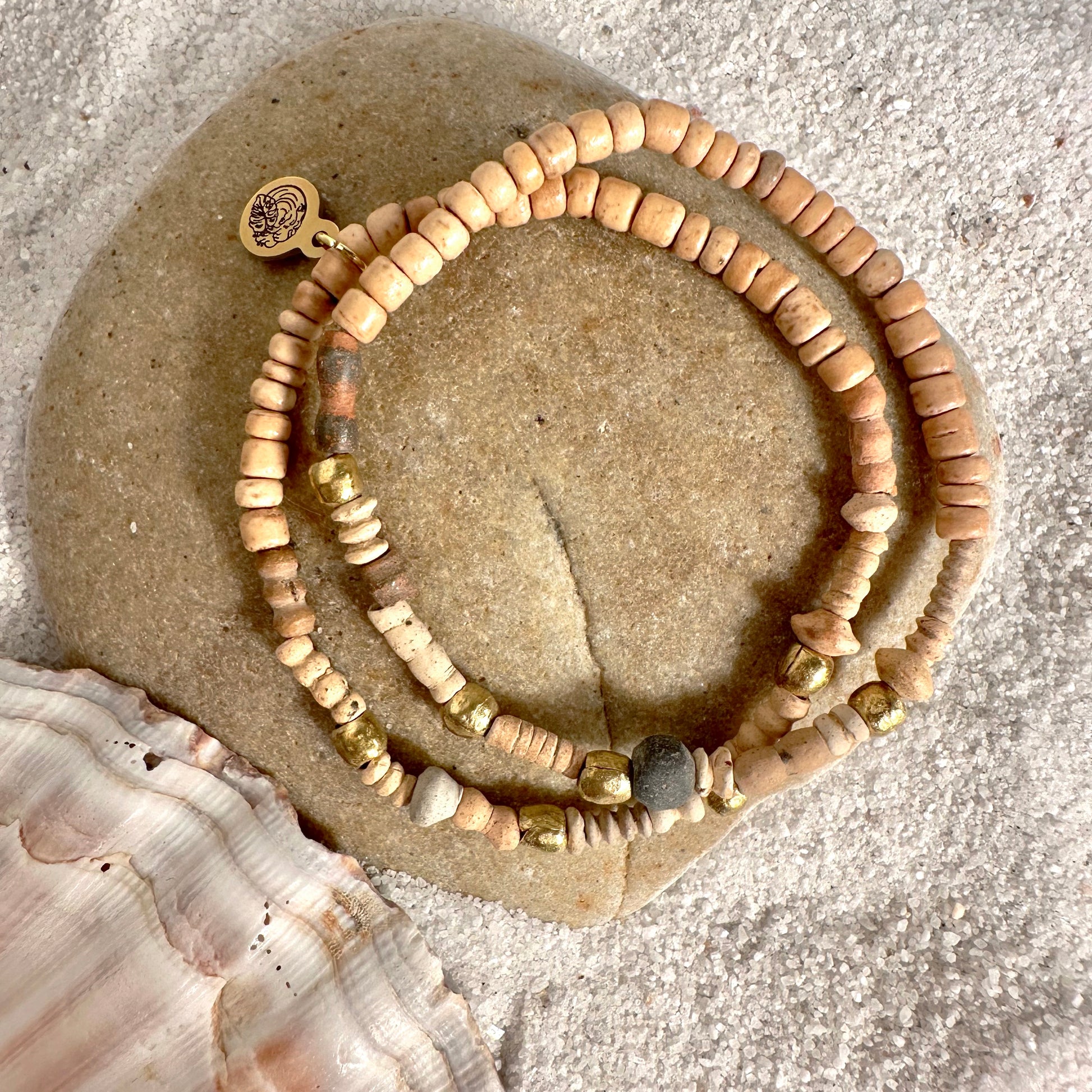 This simple yet beautiful bracelet set, comes in a pair. Can be worn alone or in a set with another bracelet or two! They are made with Mali Clay beads that are handmade in Africa. It has a touch of shine with Brass from Ethiopia, and coconut wood around the back of each.